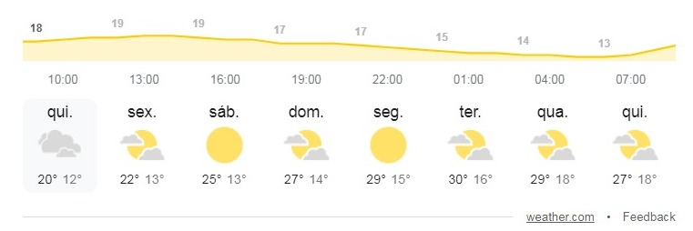 Para essa sexta-feira (19), as temperaturas aumentam um pouco, chegando a uma máxima de 23°C. E esperado ainda sol entre nuvens.